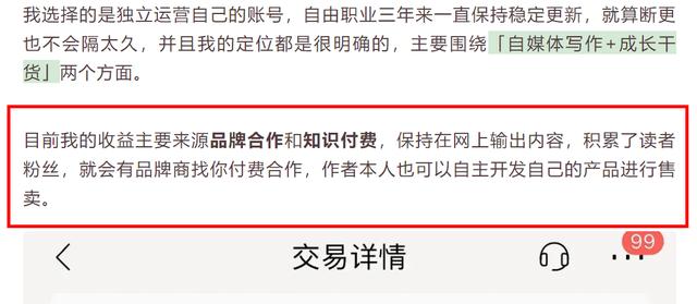 她在文章中写道:主要来源是品牌合作和知识付费。