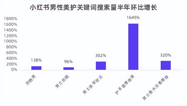 小红书2021年3月-2022年2月站内数据显示:男性美护相关关键词搜索量大幅增长,男士洗面奶祛痘控油半年环比增长732%,男士泥膜增半年环比增长142%。